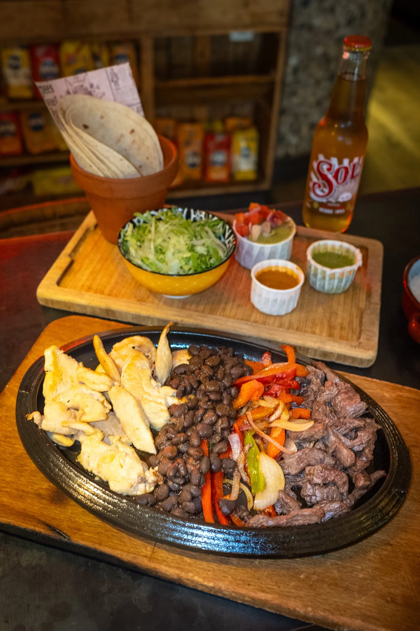 Carne de ternera y pollo a la parrilla, servidos con pimientos variados, alubias, cebolla, guacamole, lechuga, tortilla de trigo, salsas pipián y ranch. 36.80