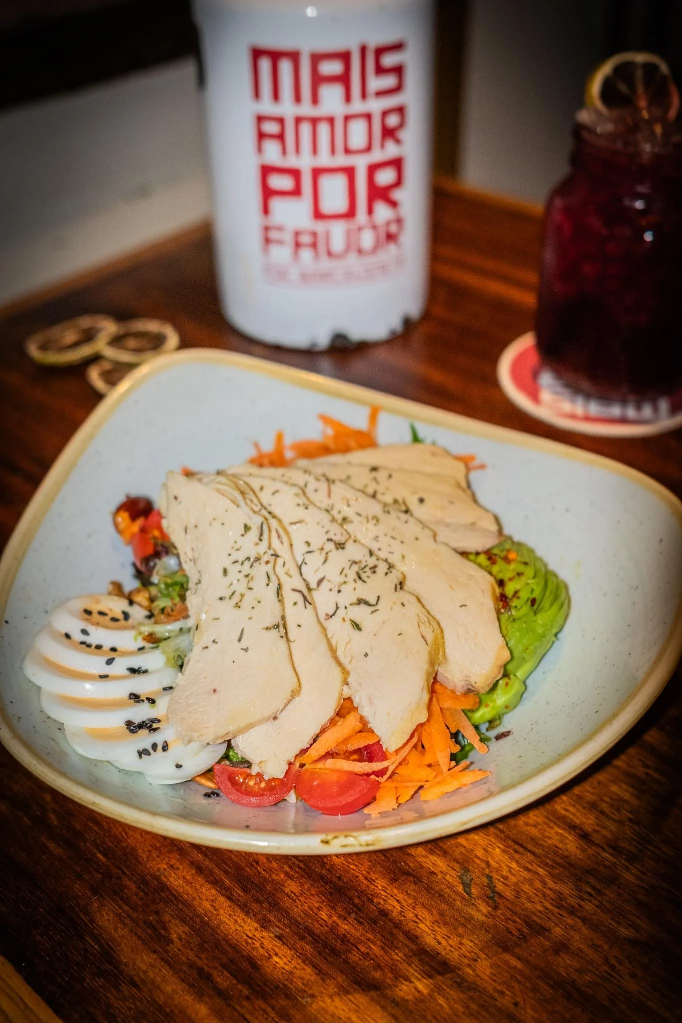 Salade mêlée avec lentilles, œuf, tomates cerises, carottes, avocat et fruits secs, servie avec viande grillée.