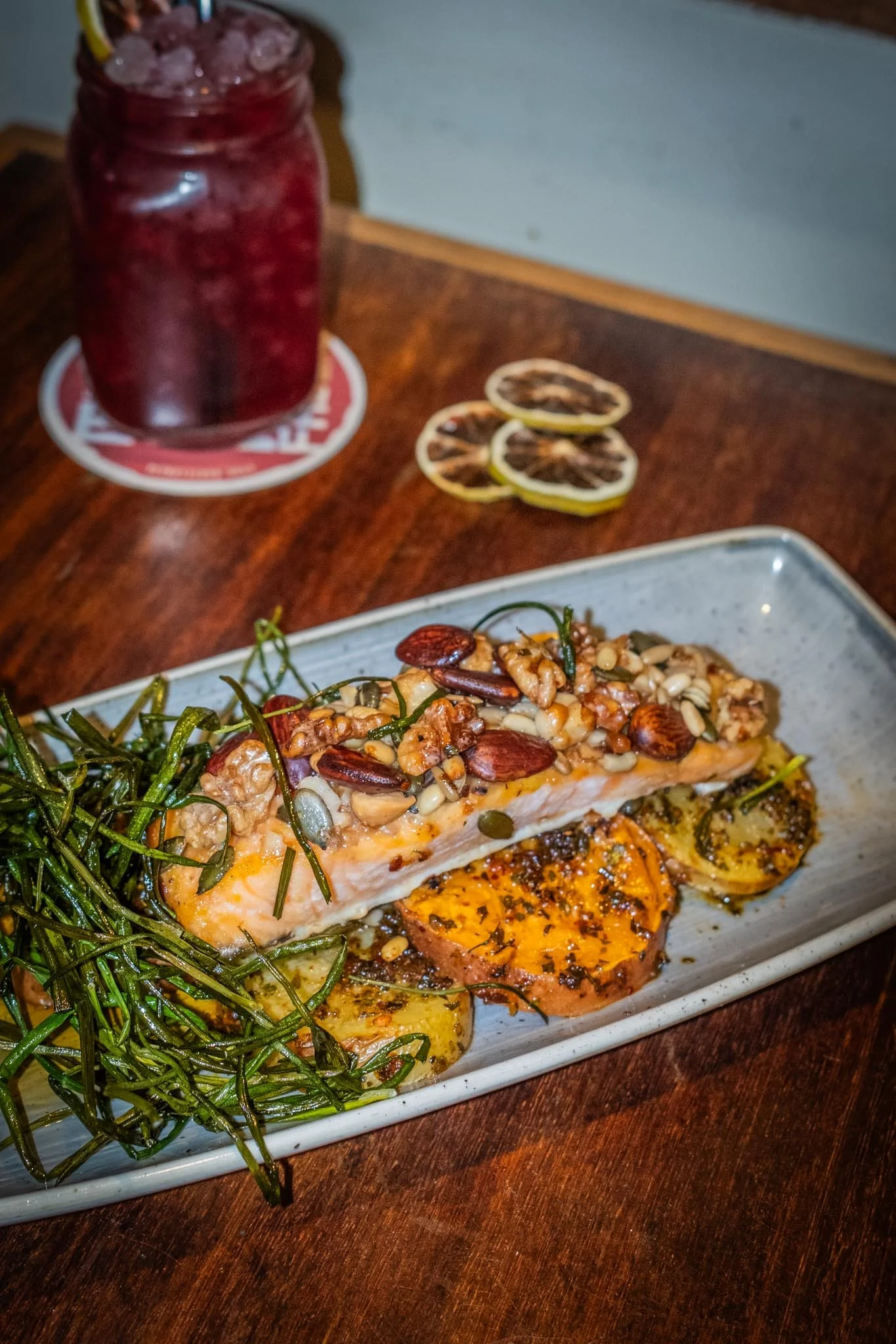 Saumon au four en croûte de fruits secs, accompagné de pommes de terre rôties et de patate douce 16.50